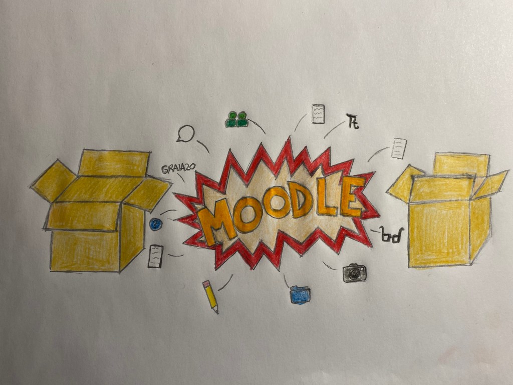I was thinking on leaving the drawing in black and white, but after seeing the finished product I quickly decided to add color. I was empty and without any depth, so it needed color. I chose a normal cardboard color for the boxes, and red for the blast ring, guess red is kinda a blast color? and I light color in the middle for the red to stand out more. For Moodle I chose orange, because the Moodle logo is orange. I thought about using red since the Noroff logo is red, but decided that It was the Moodle color that should be used since it was our campus. For the icons I used normal colors, some colors I took from the Moodle icons themself, other I chose colors that they are usually portrayed as.