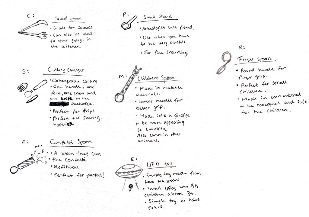 Okey! In my next assignment is a duo task where I first had to draw a normal tea spoon and use the SCAMPER method to bend it to my will! I had to apply each of the SCAMPER techniques and give a brief explanation on my findings and have I would marked them.