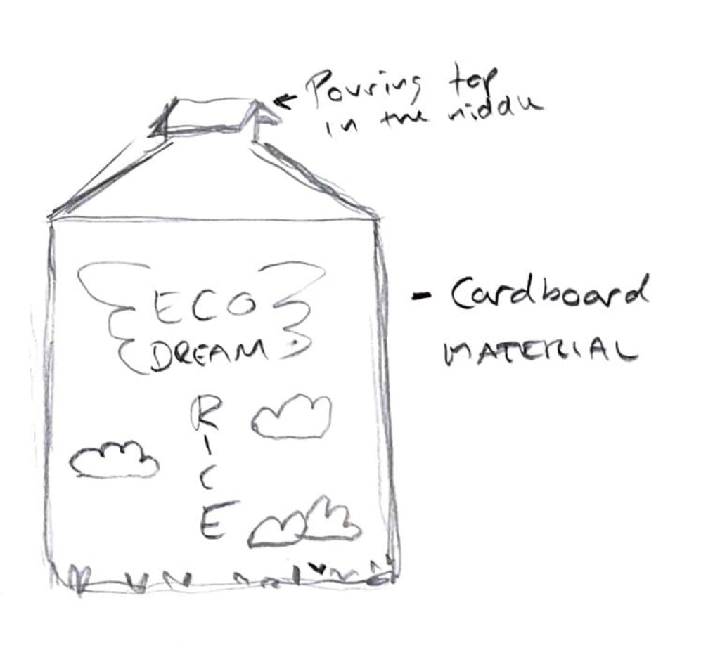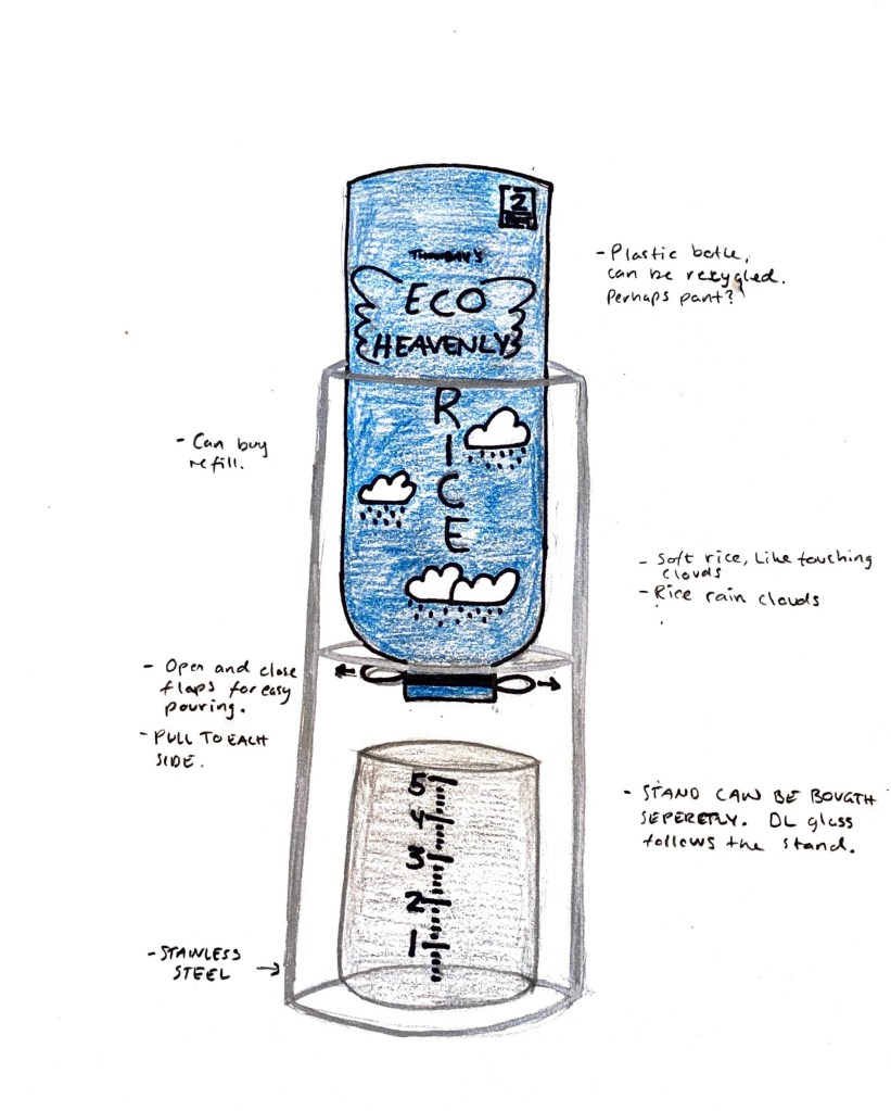 As for my final result, I went for the plastic bottle, put it upside down and placed it in a stand. I really like this design and could easily have this stand on my kitchen counter. You can buy large sacks for refill or you can “pante” (is there an english term for this?) at your local store. For the degin I went for a blue background representing the sky, and placed clouds on the blue and from the clouds it rains rice. Rice falling from the heaven. I called the rice “Thombah´s ECO Heavenly Rice”, I am Thombah (long story) and I kept the wings around ECO heavenly. For the pouring you can pull in and out two flaps on each side for easy pouring. Its sounds great in my head, but it would be so nice to actually try this for real. You can buy the stand separately and it comes with a measuring cup! Here’s the sketch for my final product: